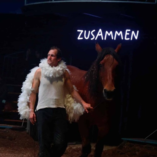 Sur la piste, les restes d’un banquet témoignent d’un lendemain de fête. C’est le petit matin, la journée de travail commence pour une troupe de circassien·nes et leurs animaux. Le public ne s’est pourtant pas trompé d’horaire, c’est bien le quotidien de ces artistes et leurs préparatifs du grand soir qu’on l’invite à découvrir. En mettant en scène l’envers des paillettes, Émilie Capliez ouvre une porte insolite sur l’univers du cirque et nous offre d’explorer l’intimité d’un travail d’équipe où humains et animaux créent ensemble. Entraînements, soins aux chevaux, gammes musicales, tout le labeur invisible, les doutes et les efforts, deviennent ici spectacle. Les surprises jaillissent, tandis que s’enchaînent acrobaties, voltige, mât chinois. Créateur d’égal à égal avec l’humain, c’est l’animal qui inspire les scènes, par son caractère, son langage singulier. Ici une chorégraphie naît d’un moment de jeu avec les chiens, là un morceau de musique trouve son origine dans le souffle d’un cheval au galop. Quand arrive le grand soir, la magie est prête à opérer, l’atmosphère se fait onirique… et le public est plus que jamais invité à la fête !